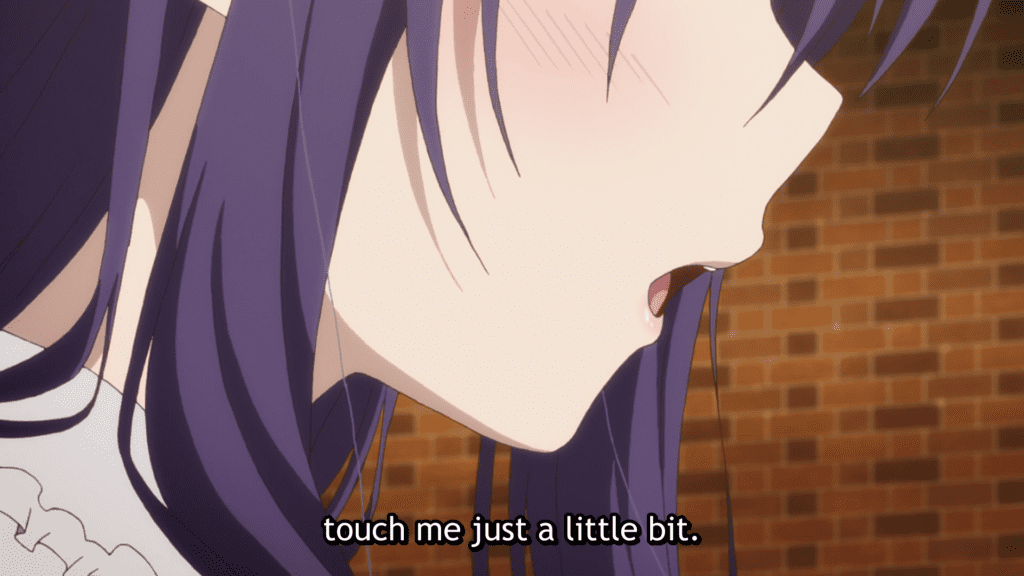 Things escalate horrifyingly quickly during the last 10 minutes: From a couple of vaguely skeevy shots focusing on the girls’ knees, to one of the girls blackmailing Kyo with a false accusation of assault, to crotch-shots and Sudden Lipstick during the musical number, and finally, for the rotted cherry atop the melting sundae, to one of the girls straight-up propositioning our high school protagonist—and him blushing at the suggestion.
