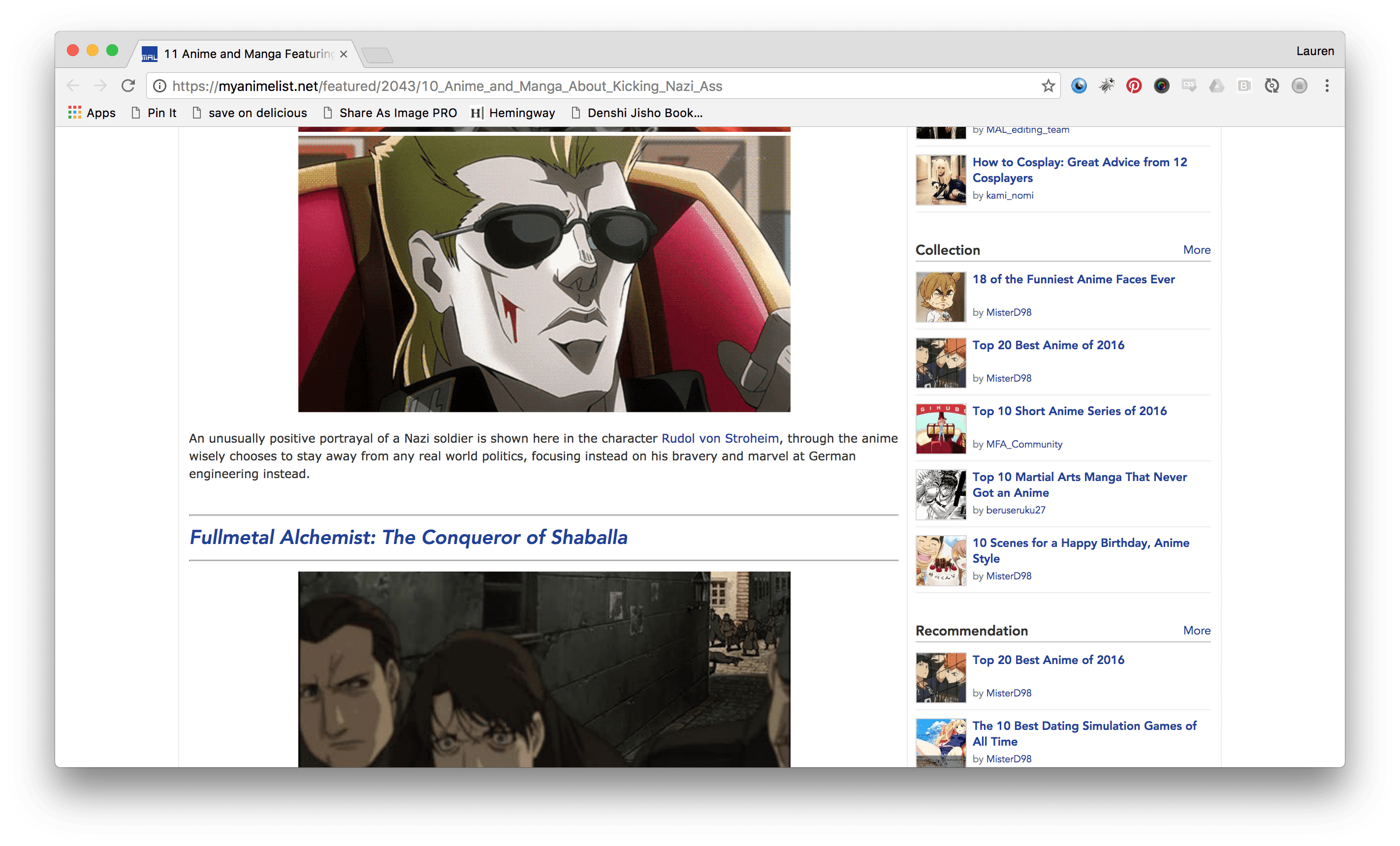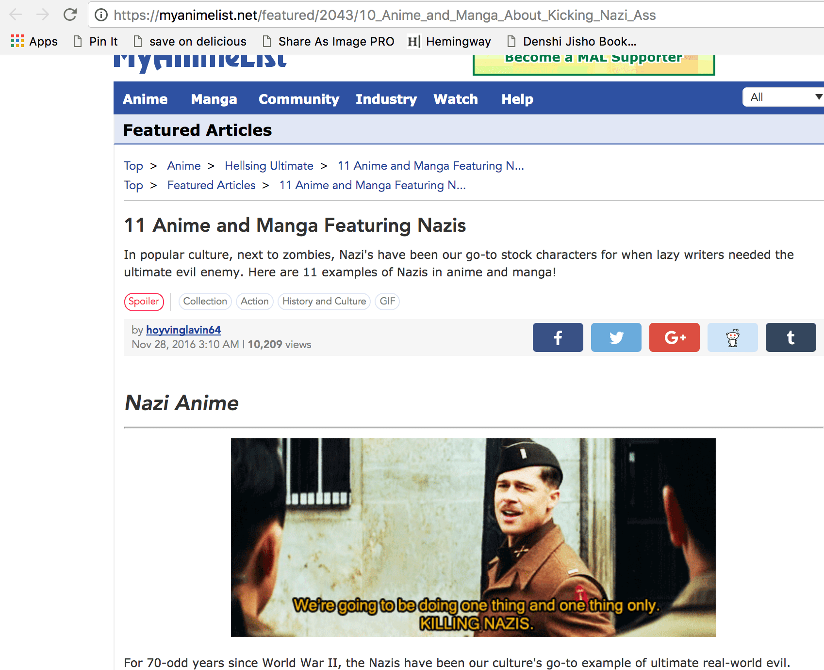 This unfortunate connection all came to a head for My Anime List contributor Reuben Baron when he discovered his November article, “10 Anime And Manga About Kicking Nazi Ass,” had been rewritten in a gentler tone toward Nazi anime characters. The new article was titled “11 Anime And Manga Featuring Nazis.”
