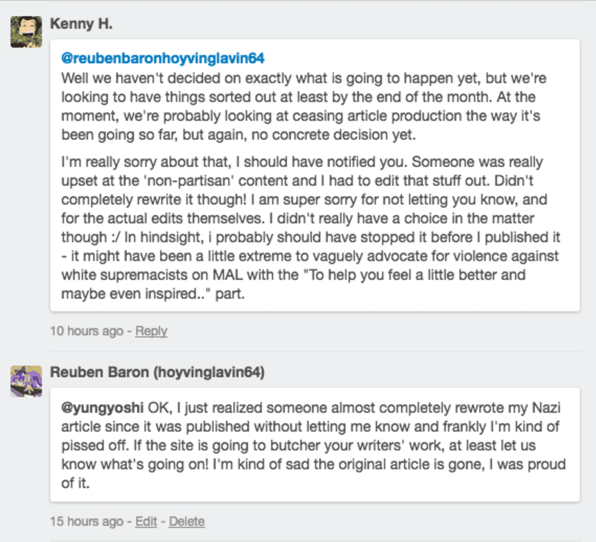 Akiyama also confirmed that the reason Baron’s article was edited was because of an internal concern, not a reader complaint. In the screenshot, Baron’s editor tells him somebody was “really upset” about the article. It turns out that was somebody inside My Anime List.