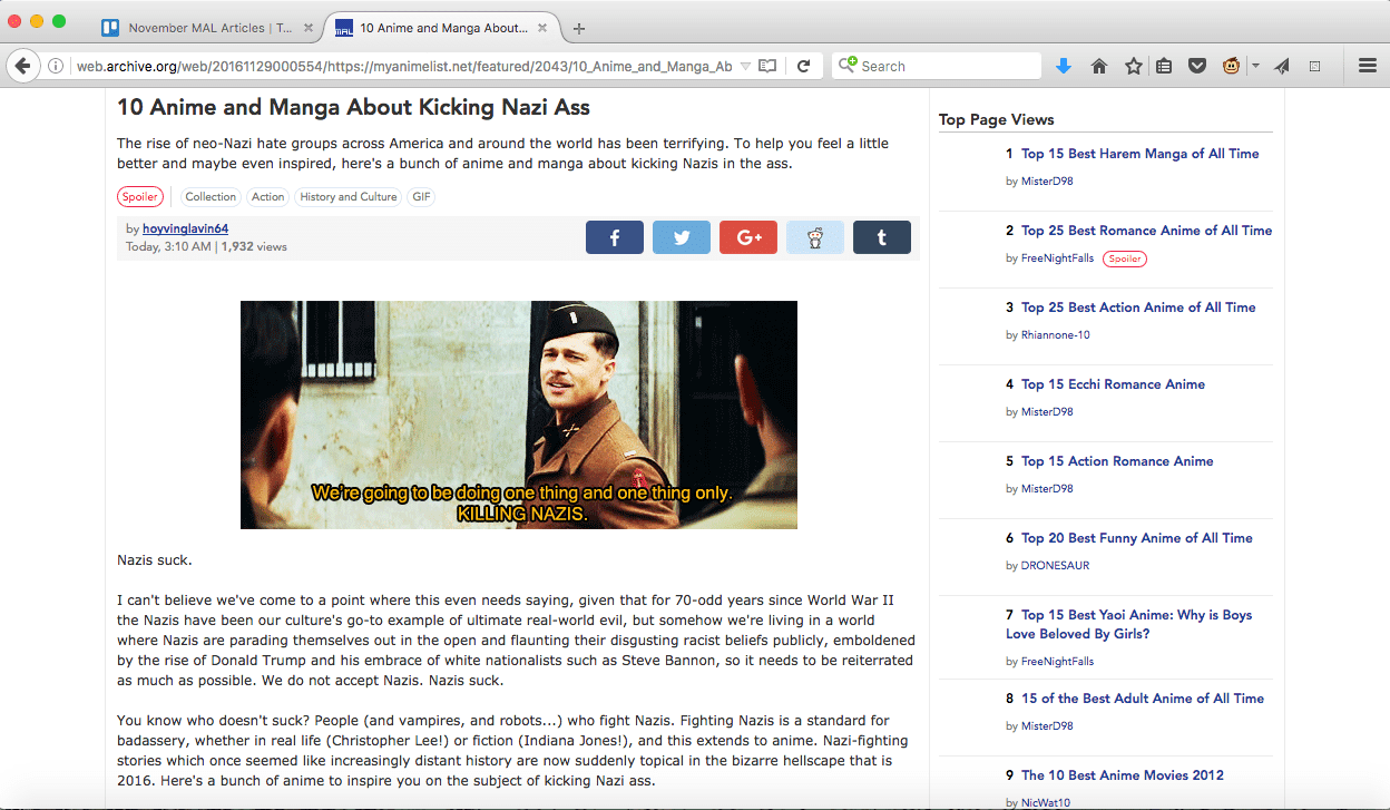 Baron’s original article was published on November 29, 2016. It passed editing with one small change—his My Anime List editor asked him not to use the term “alt-right” as a synonym for neo-Nazi, a terminology quibble taking place at other similarly large op/ed sites.
