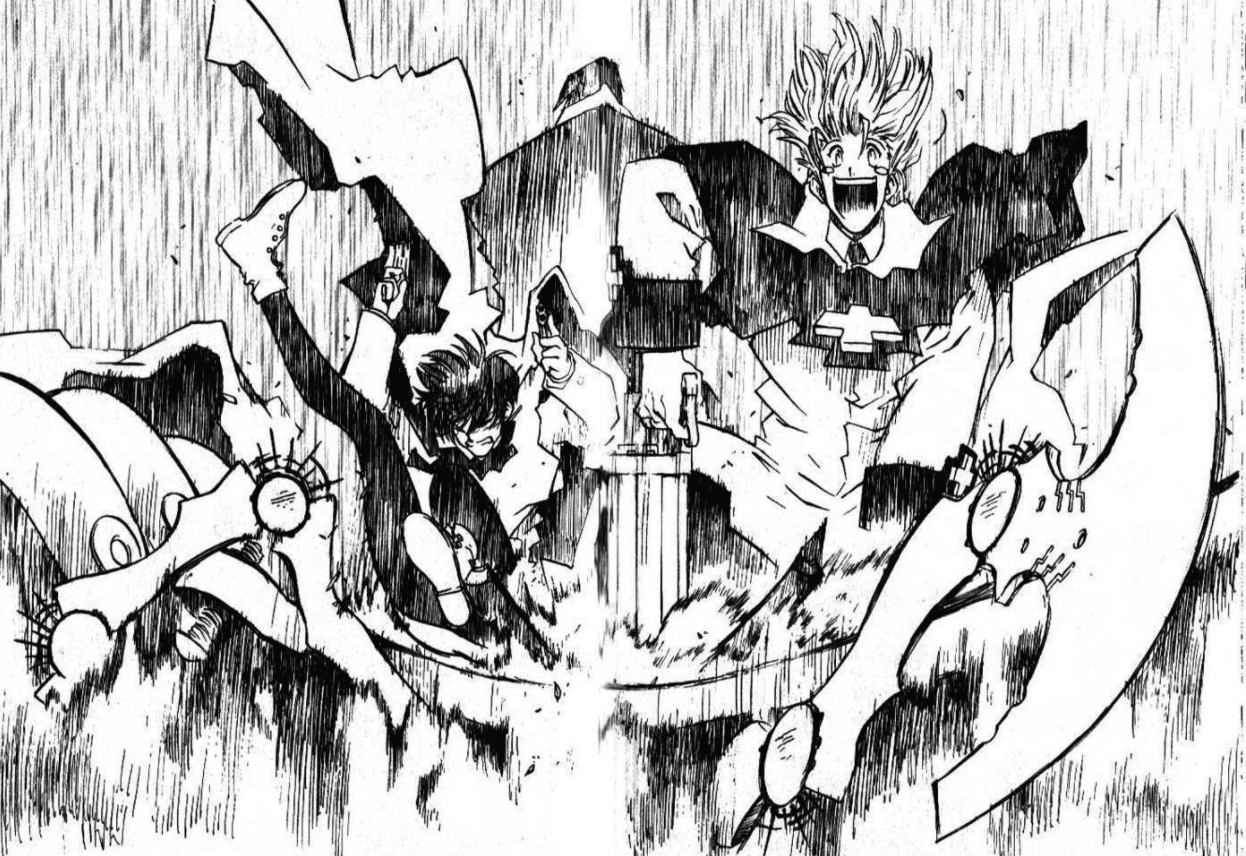 This all sets the scene for Trigun to be a little out of ordinary, a bit scruffier and more radical than its Space Western cousin, Cowboy Bebop. Nightow’s narrative is more inherently political than some anime and manga at this time period, full of contradictions and conundrums that make Trigun stand apart from many titles that have come after it.