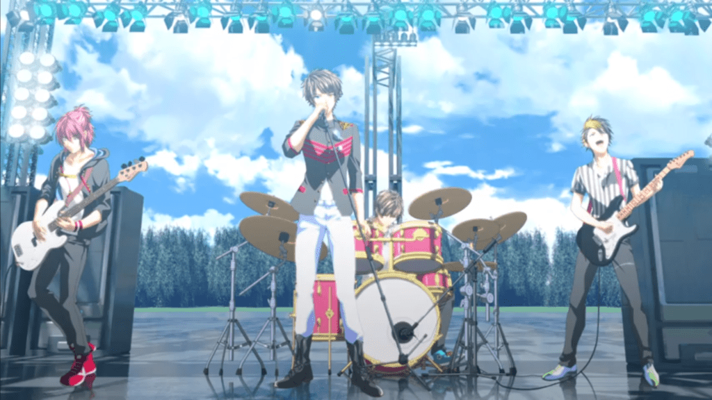This lack of polish carries over to the characters as well, who have much more distinctive designs than the glossy sameface of TsukiPro, with lead singer Reon’s gold-and-blue eyes serving as the Extra cherry atop the Edgy sundae. And, while their personalities are by no means layered, they do at least get to emote and act silly, nervous, and especially ANGSTY. From the opening shot of a Sad Boy sitting in his convertible in the rain and the opening theme entitled “p.s.i hate you♡xxx,” you know there’s gonna be some Dashboard Confessional-levels of Boys Having Feelings in this show.