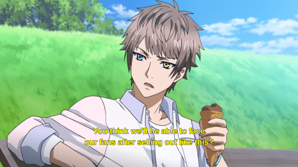 It’s going to be impossible for me to talk about DYNAMIC CHORD (so many caps-lock titles this season!) without comparing it to TsukiPro the Animation, because they’re basically the same show. Each follows four all-male music groups through the ups and downs of their career. Neither features a single female character nor even the implication that women might exist, somewhere, perhaps on an island in the Aegean Sea. Each was created primarily to sell singles and merchandise. Hell, each even features the main group working in a commercial in the premiere.