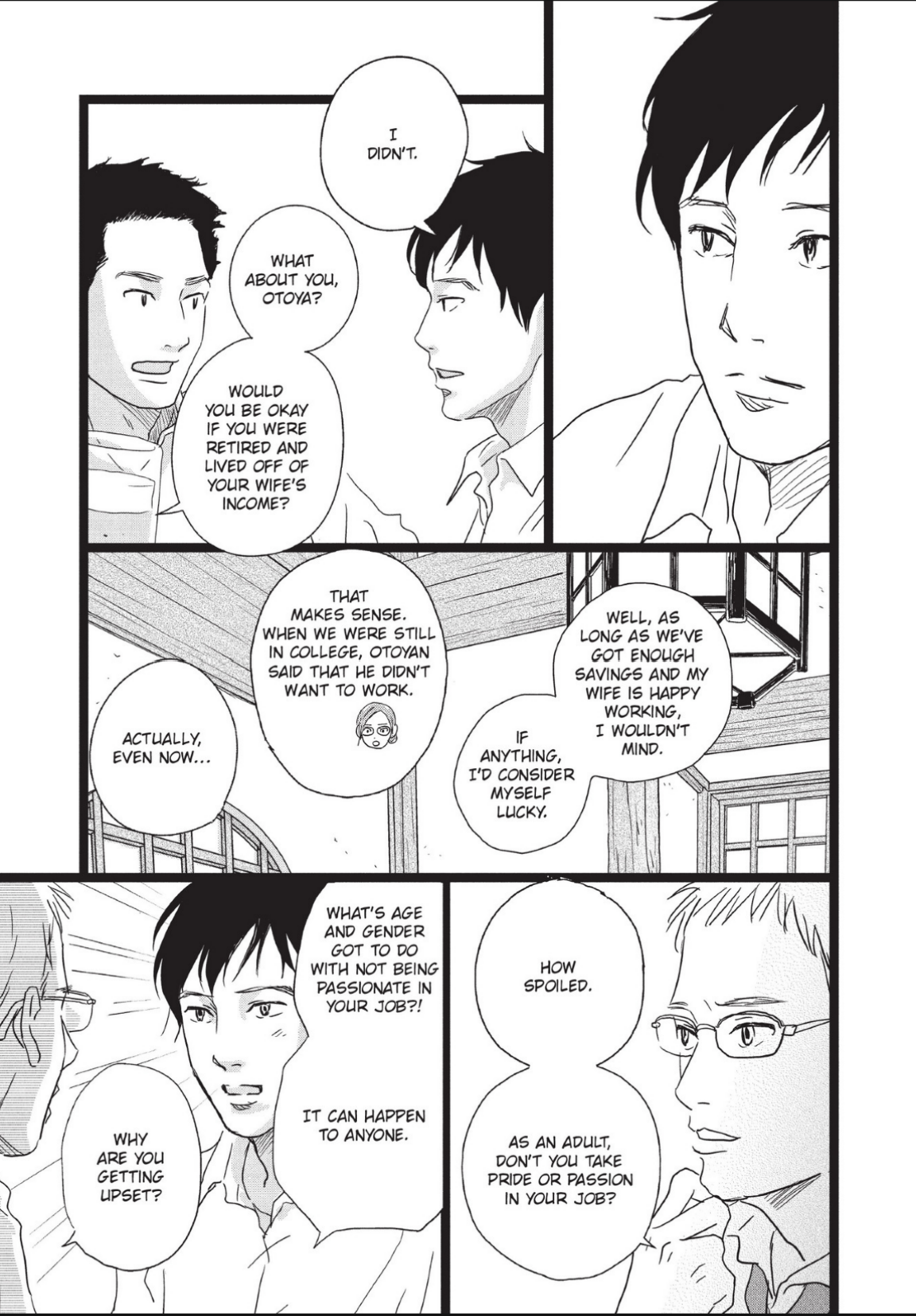 Otoya telling his dude friends he want to be a house husband and they tell him that's "unmanly" and lazy of him.