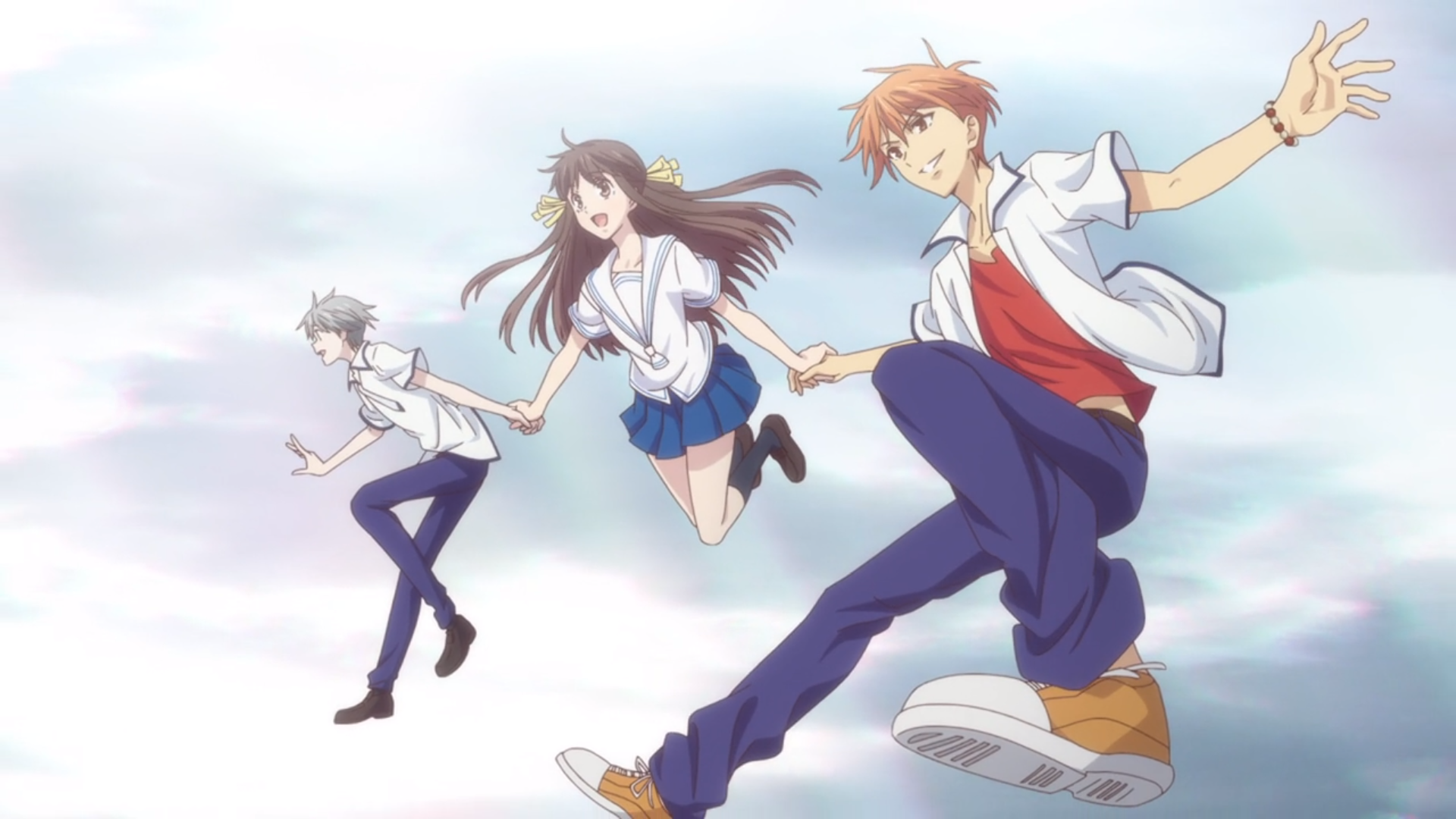 Yuki, Tohru, and Kyo holding hands and smiling as they leap across a blue sky