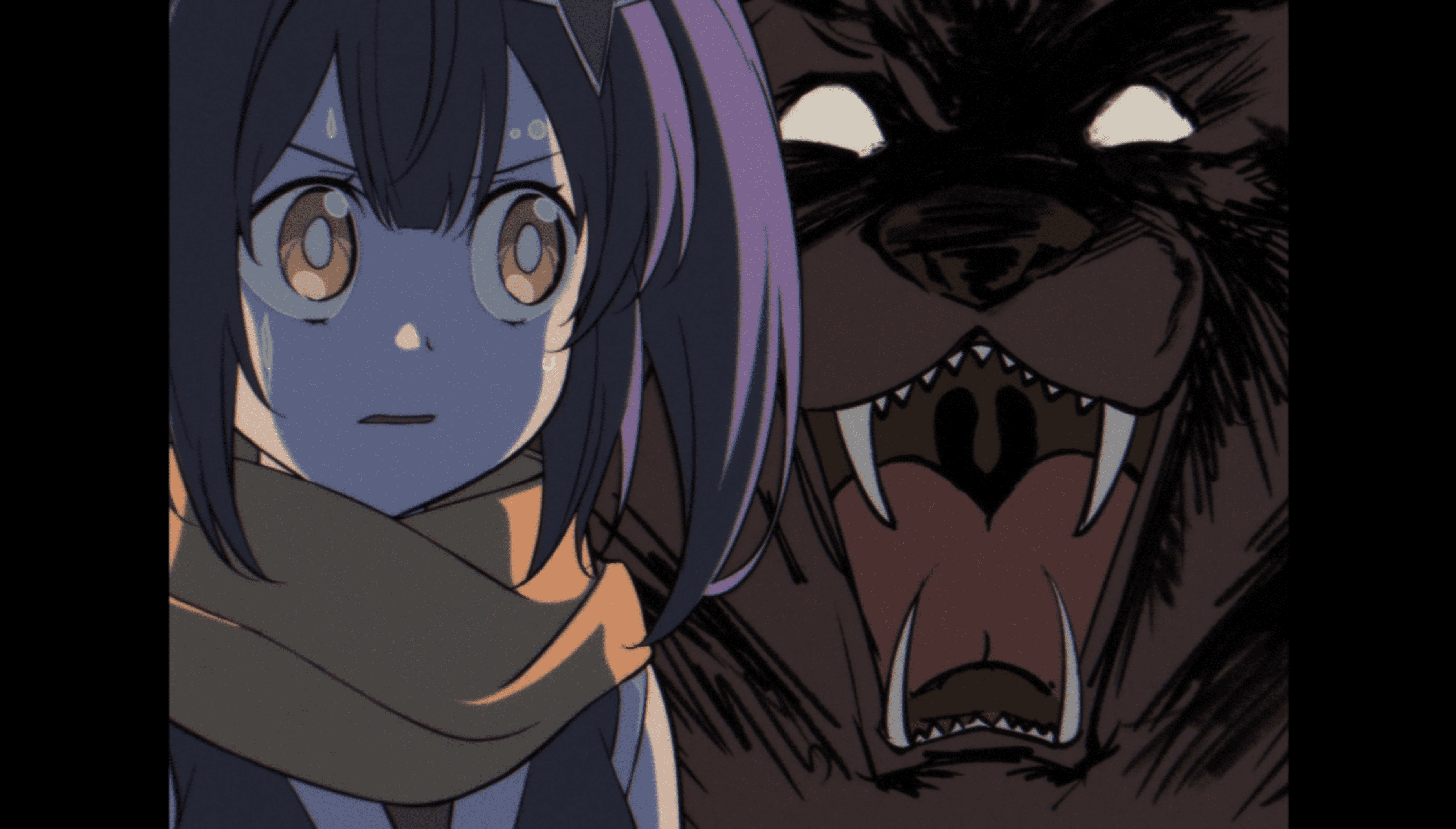 Satako grows uneasy as a fierce beast approaches from behind.