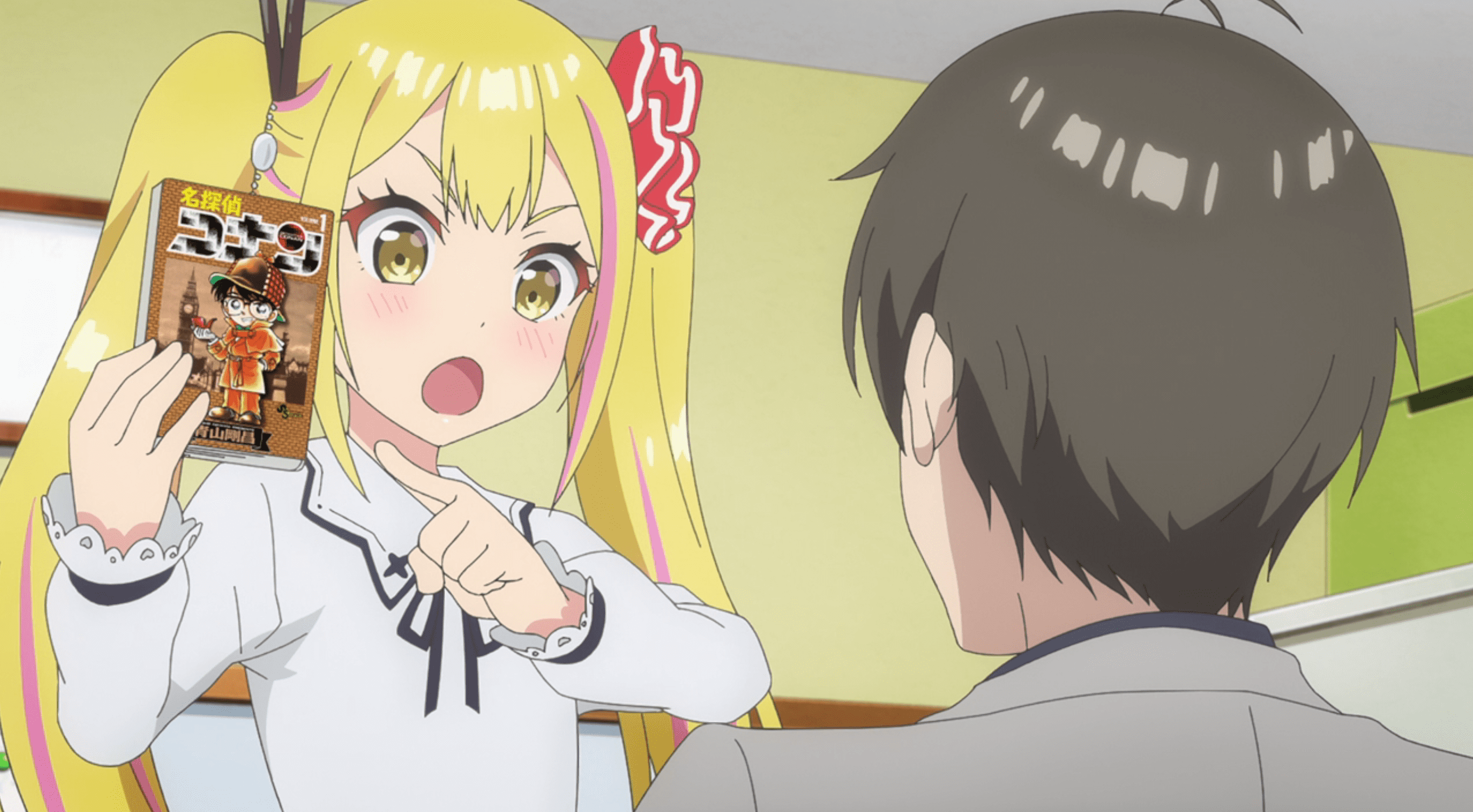 Closeup of Sara holding up a copy of the manga Detective Conan, pointing to it and looking seriously at Sosuke