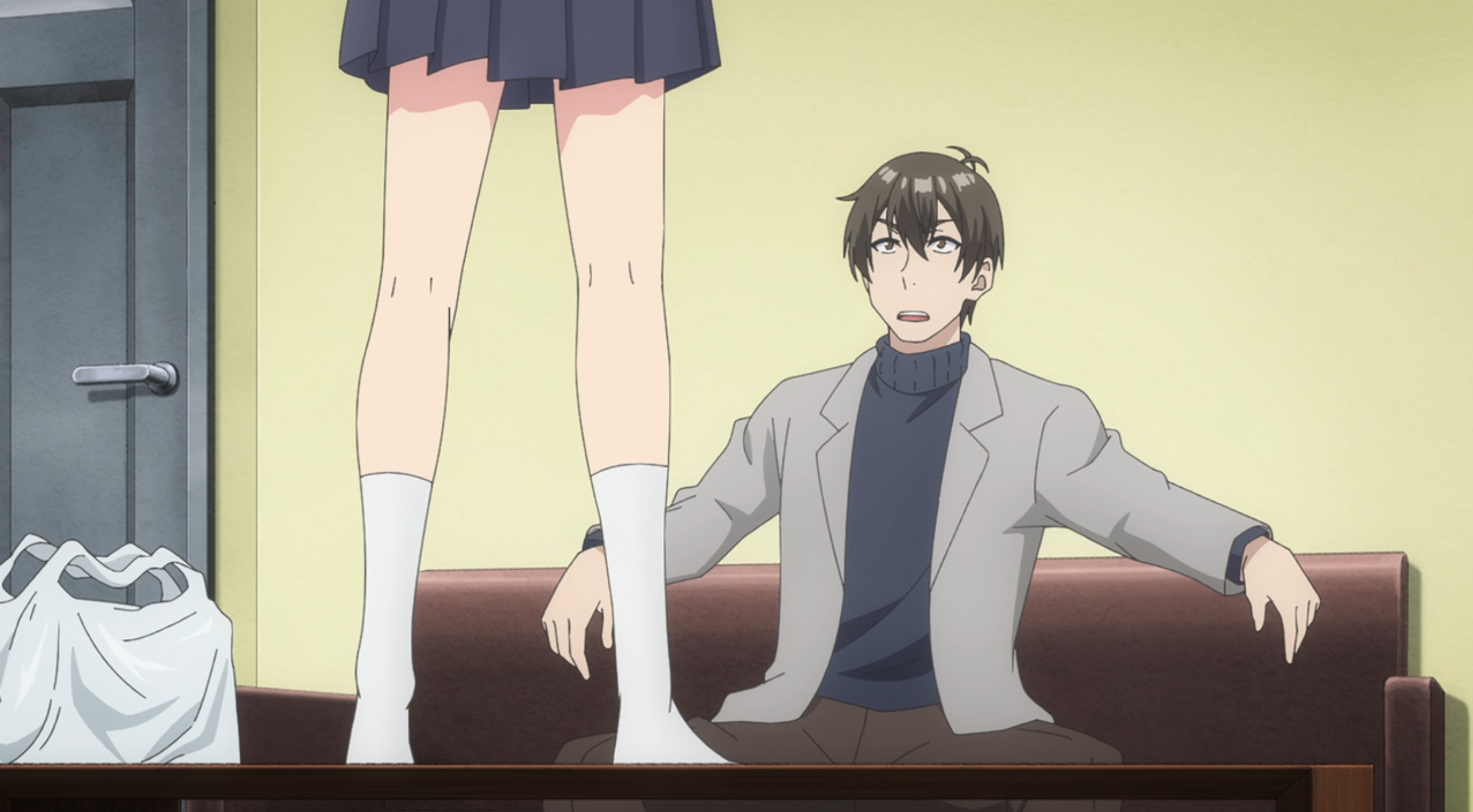 Sara standing on a coffee table while Sosuke sits on the couch below her. The shot cuts off the view of her body so the audience can only see the hem of her skirt and her legs