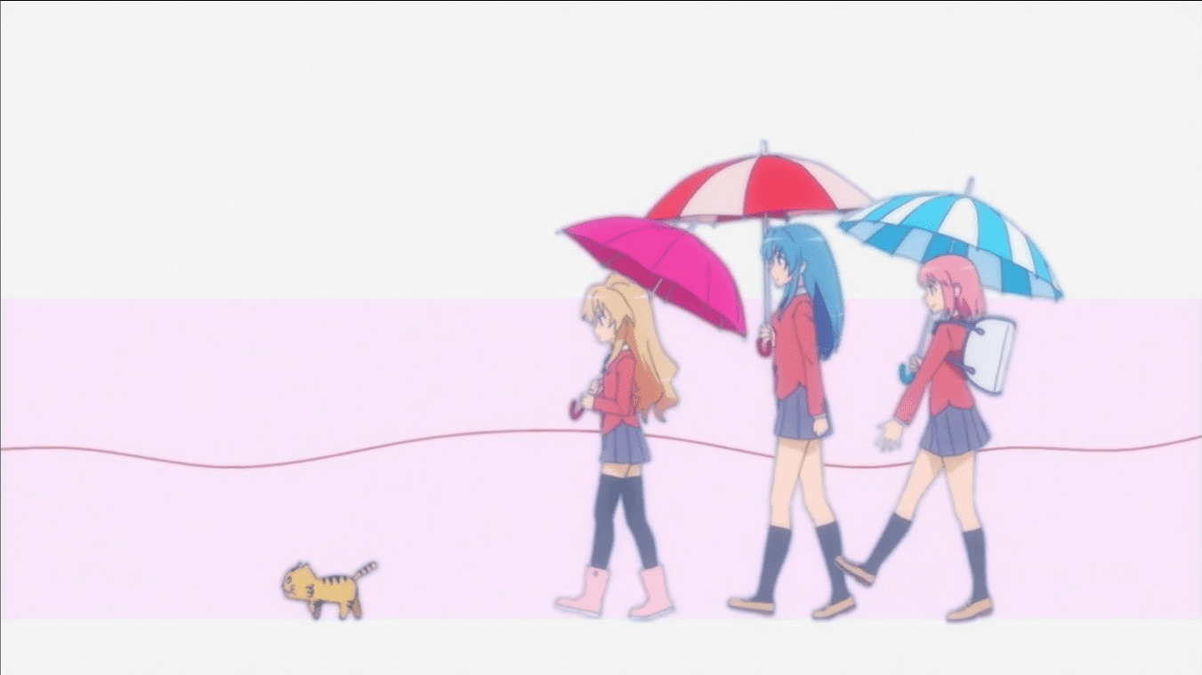 Taiga, Minorin and Ami walking under colourful umbrellas, an image from the show’s first ending theme