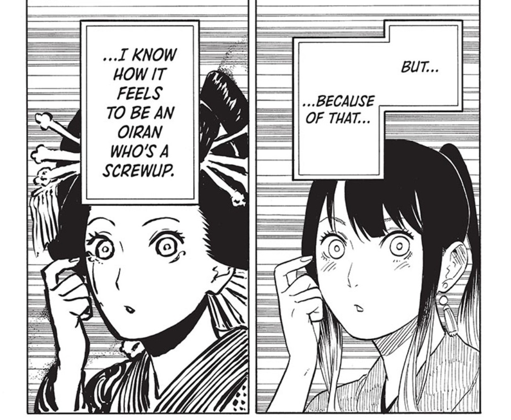 Two side by side manga panels, one showing Akane as she normally looks and the other showing her as the courtesan character