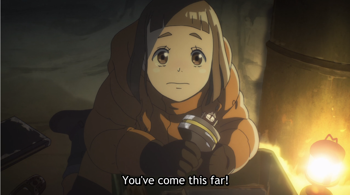 The lead of A Place Further in the Universe crouched with a lamp and a flashlight, determined. Subtitle: You've come this far!
