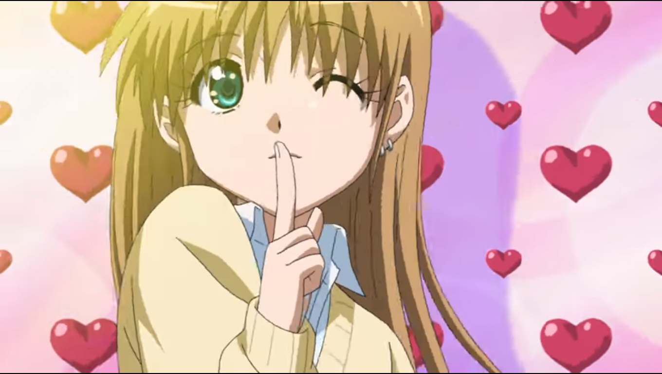 a high schooler winking and holding a finger to her lips against a background of hearts
