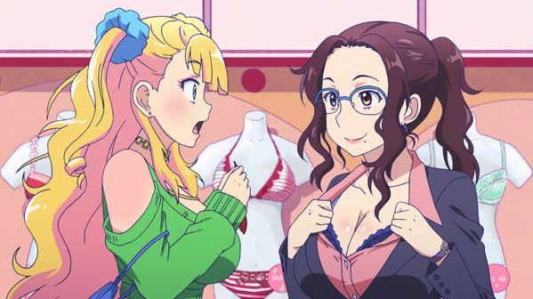 Galko from Please Tell Me! Galko-chan looking amazed at another woman as they stand in front of a swimsuit display