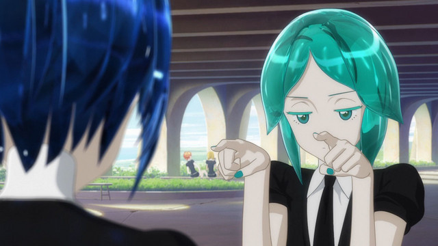 Phos from Land of the Lustrous pointing both index fingers at another gem.