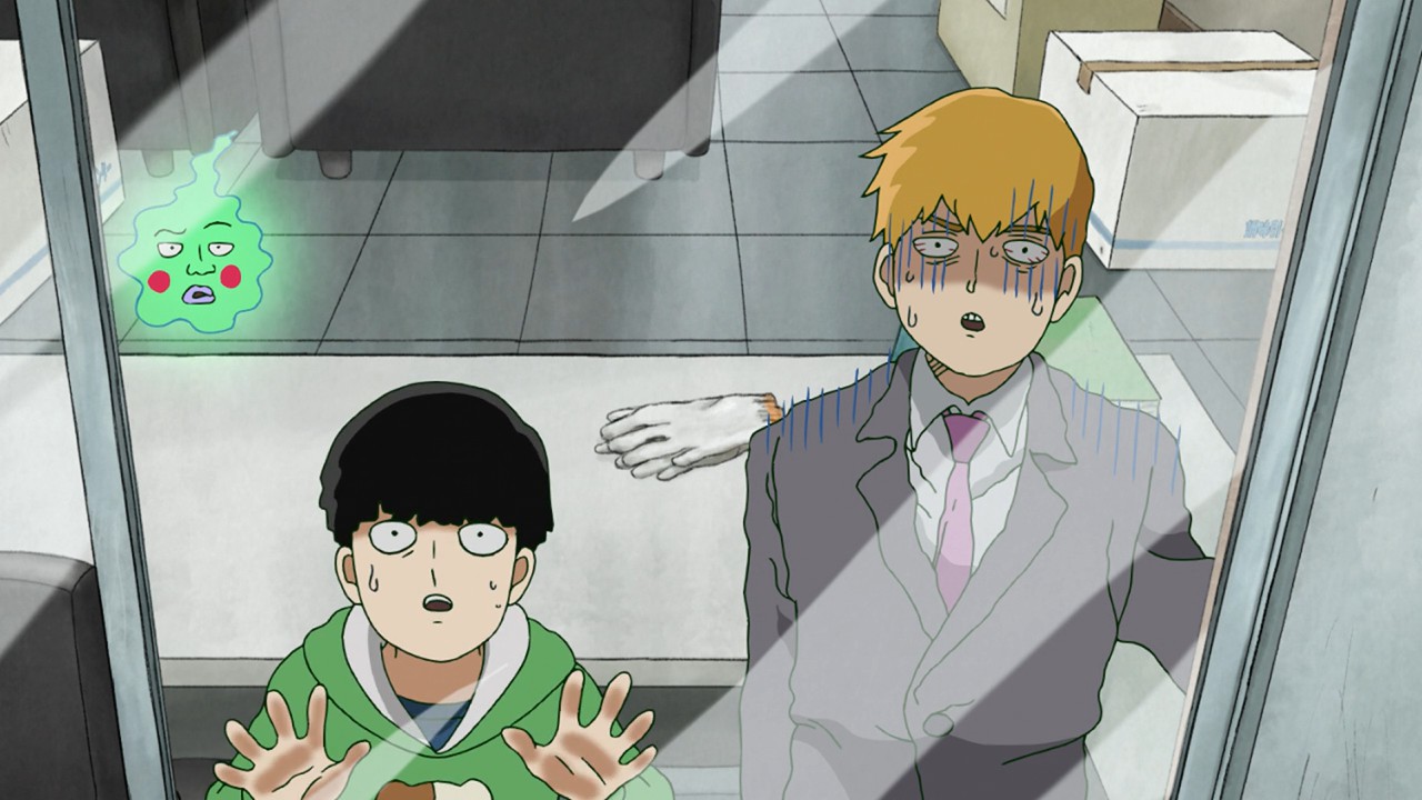 Mob, Reigen, and Dimple look out the window of an empty office. All three seem perturbed.