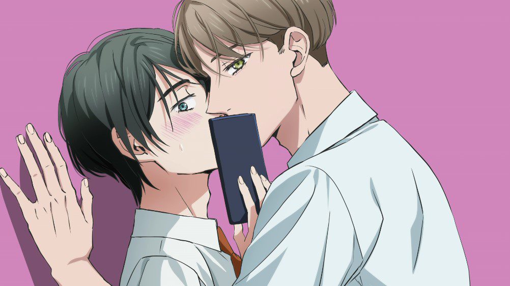 Adachi and Kurosawa mid-kiss, Adachi hiding their lips with his phone