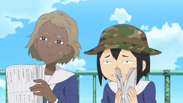 Doumeki and Asakusa from Eizouken looking at something in suspicion and distress