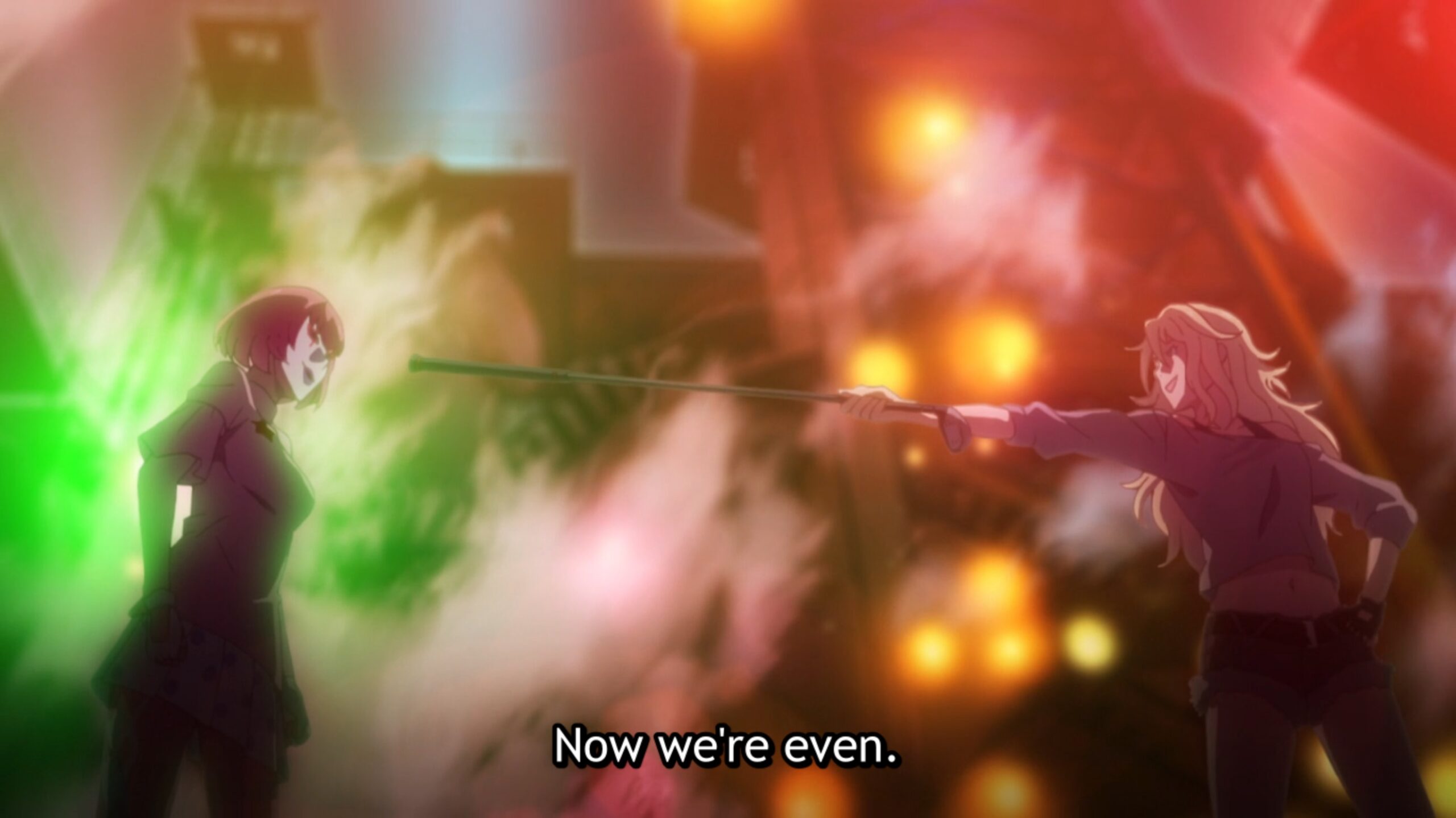 Two women standing across from one another against a neon-lit night time backdrop, the lights stark and dramatic. A blonde woman is pointing a golf club at her competitor, who is wearing a clown mask and a pink wig. Subtitle text reads: Now we're even.