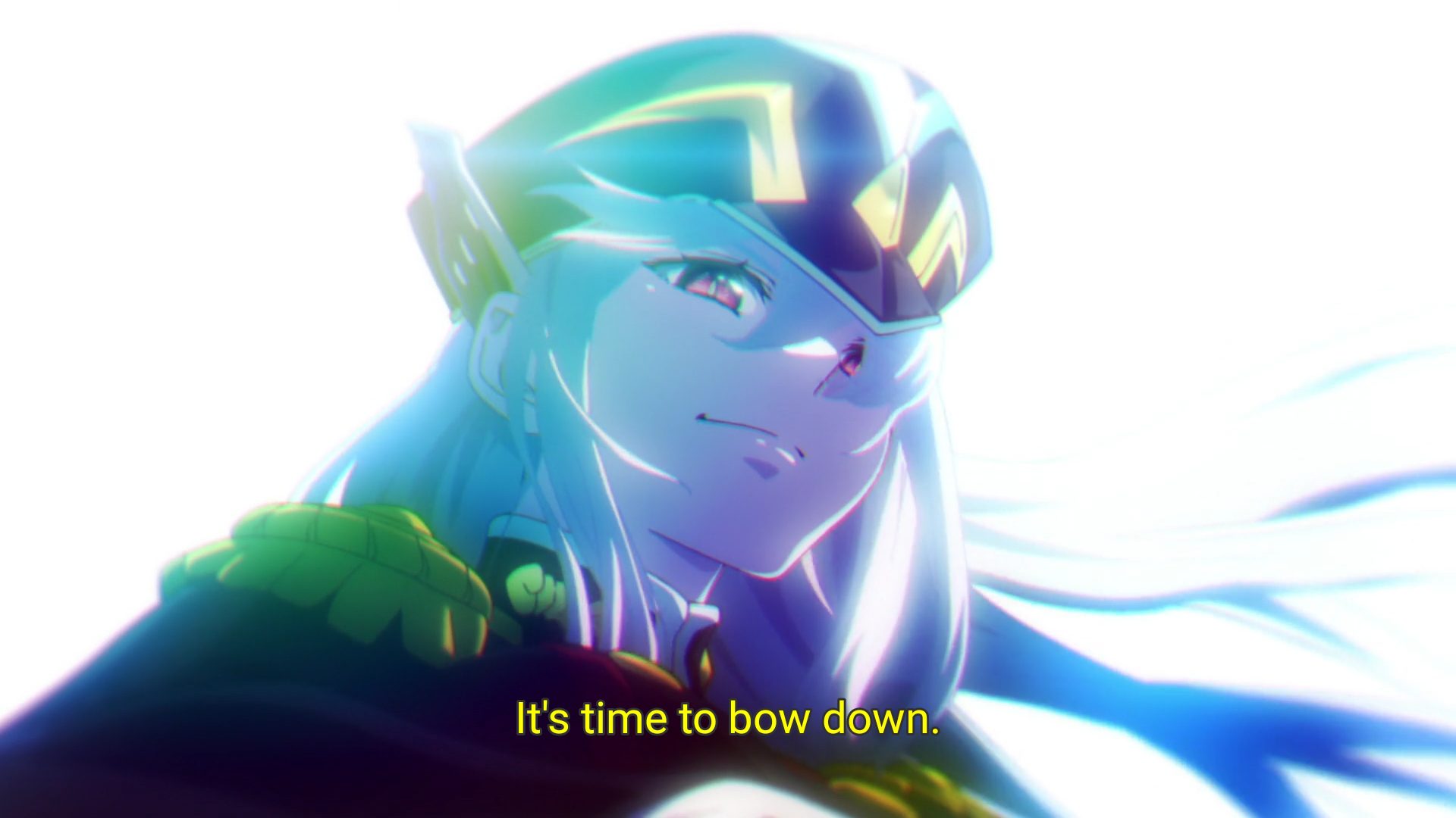 Closeup of a young woman in military-style uniform, smirking down at the camera with a bright white light behind her. Subtitle text reads: It's time to bow down.