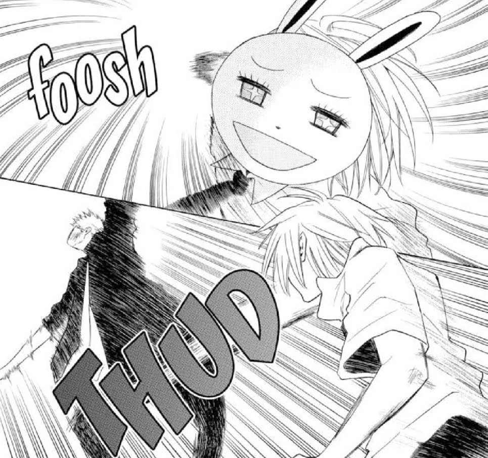 A manga panel of a teen girl (Mafuyu) wearing a bunny mask kicking a male student. Sound effects read "foosh" and "THUD"