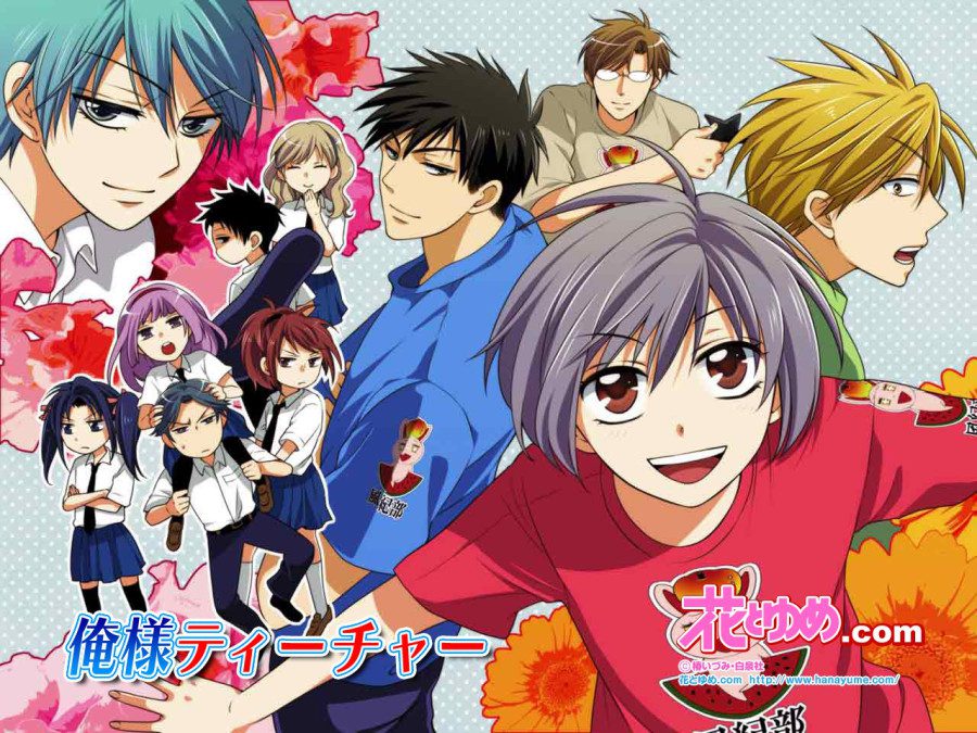 A group shot of the cast from "Oresama Teacher." A teen girl, Mafuyu, is smiling in the foreground, with two teen boys and an adult man directly behind her. Multiple other characters of varying genders fill the frame behind them.