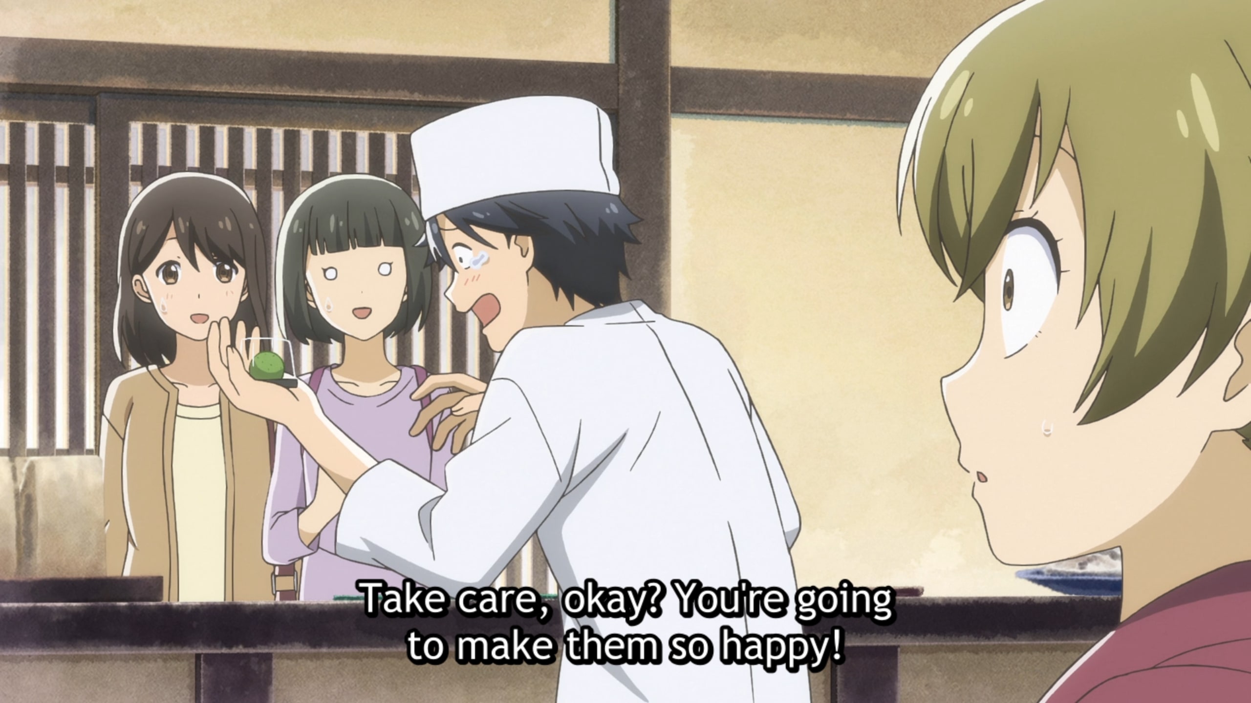 Nagumo holds a mochi in his hand while crying and says to the mochi, "Take care, okay? You're going to make them so happy!" Itsuka looks on in surprise. On the other side of the counter, the two customers look equally baffled.