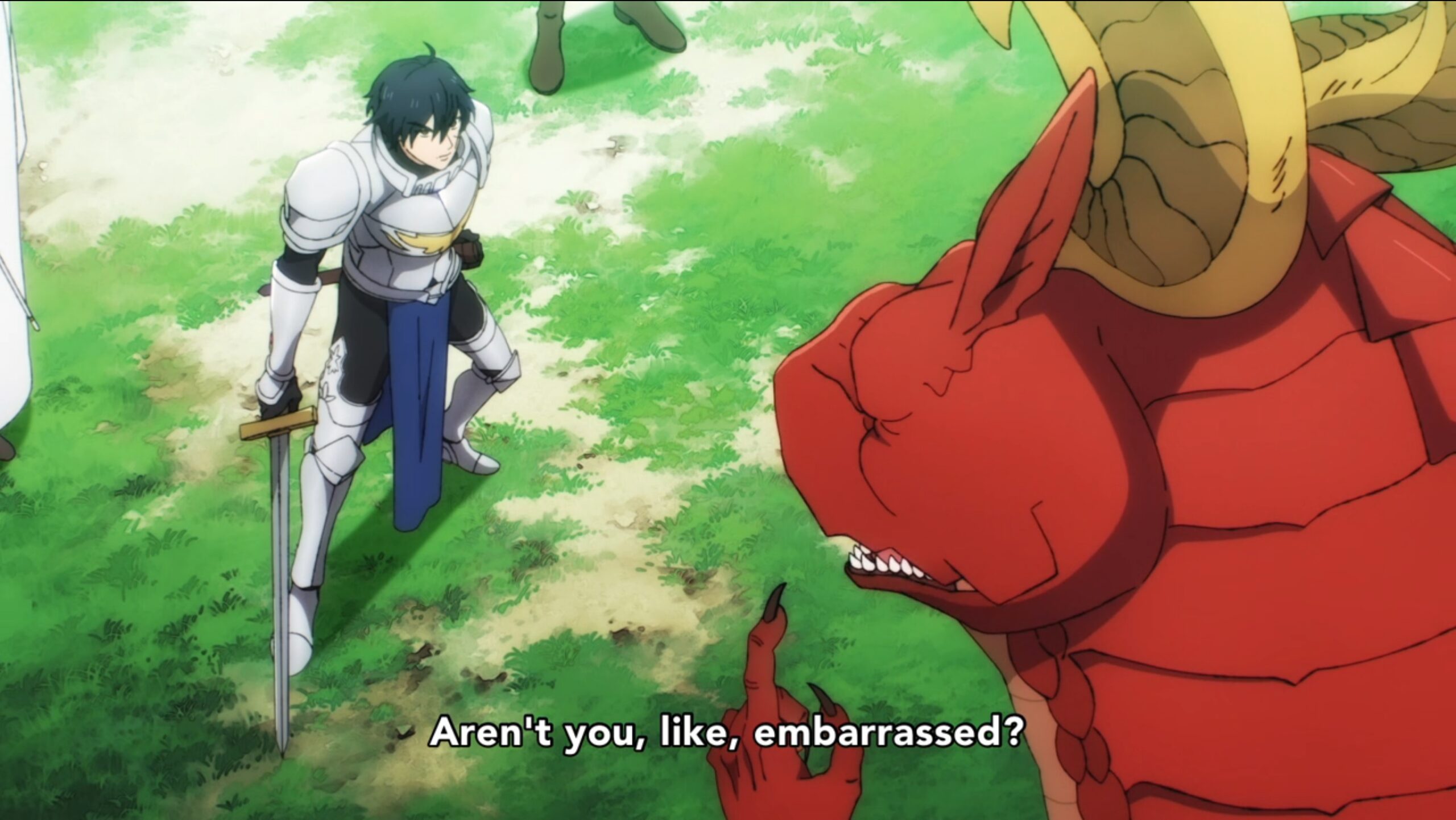 A red dragon looking down at a man holding a sword. Subtitle text reads: Aren’t you like, embarrassed?