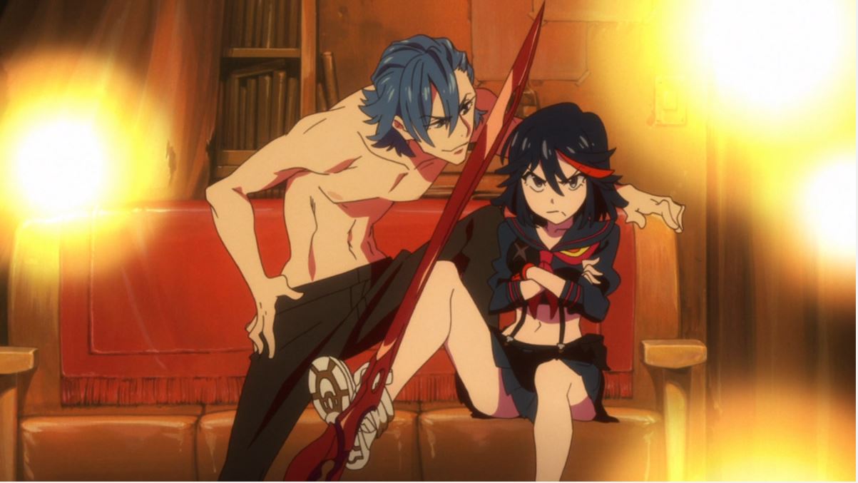 Ryuko fending off her leering shirtless teacher by flipping up her blade with her foot
