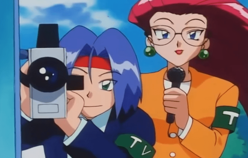 Team Rocket dressed as reporters. James is holding a camera, Jessie a microphone.