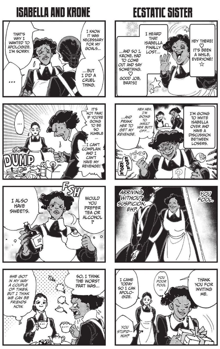 Although there are significant issues with Krone’s character design and position as the only prominent Black woman (a conversation that’s outside the scope of this article, but AniFem welcomes pitches), she is ultimately written as a fierce survivalist and sympathetic figure. The same is true of Isabella, who decided the best she could do was help the kids live as happily as they could before their deaths.