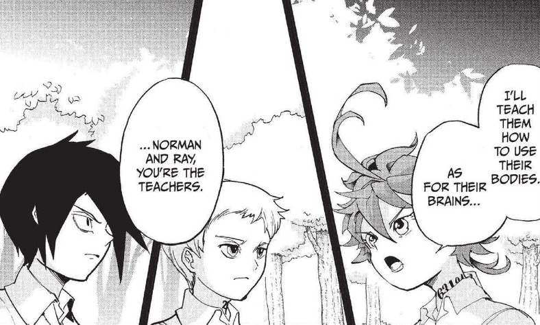 Three split-panels showing Emma, Norman, and Ray. Emma says that she'll teach the younger kids how to use their bodies while Norman and Ray teach them how to use their brains.