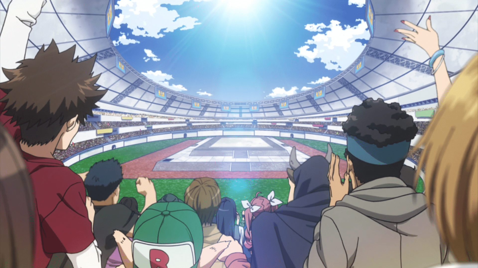 An open-air stadium with a wide, slightly raised platform in the center. The stadium is crowded with fans, some with hands raised as if cheering.