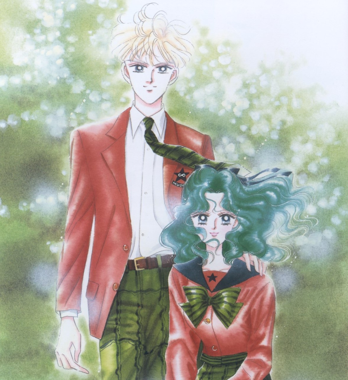 Haruka and Michiru in their school uniforms. Haruka's hand is on Michiru's shoulder.