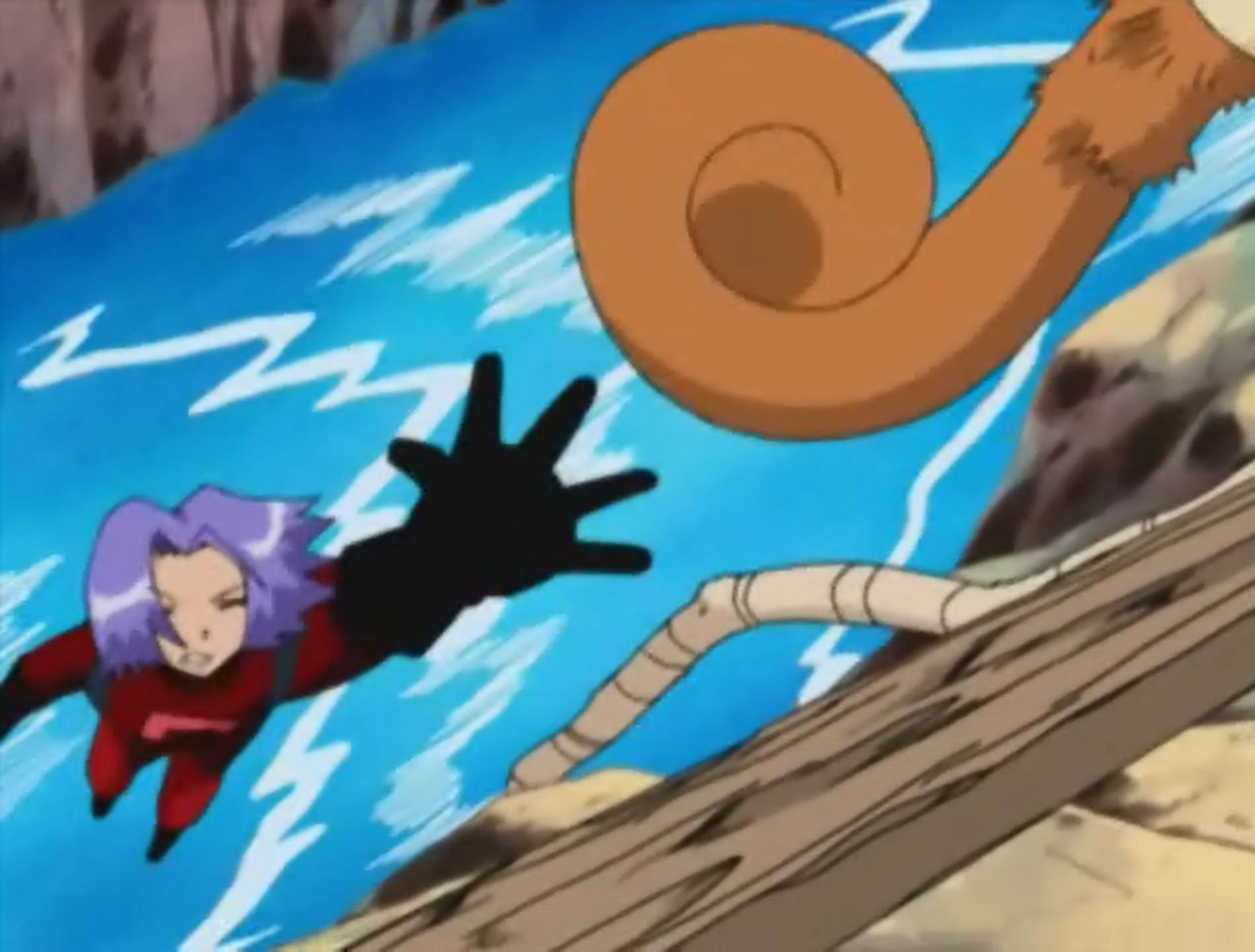 James releases his hold on Meowth's tail and falls into a canyon with a river running through it