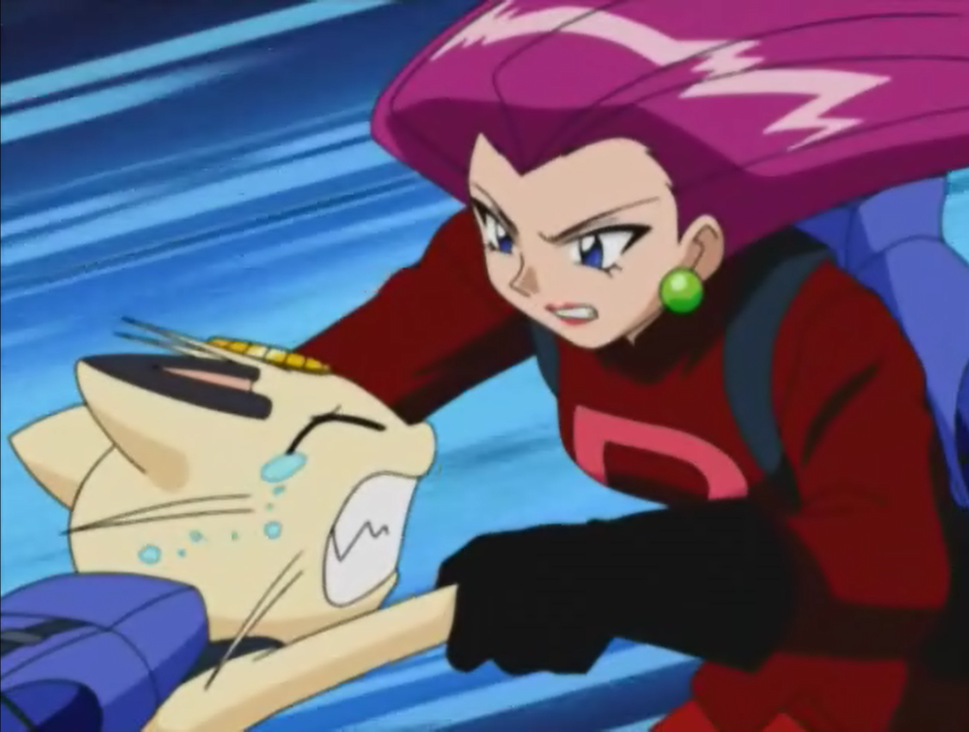 Jessie grab onto Meowth's paws. He grimaces in pain and fear.