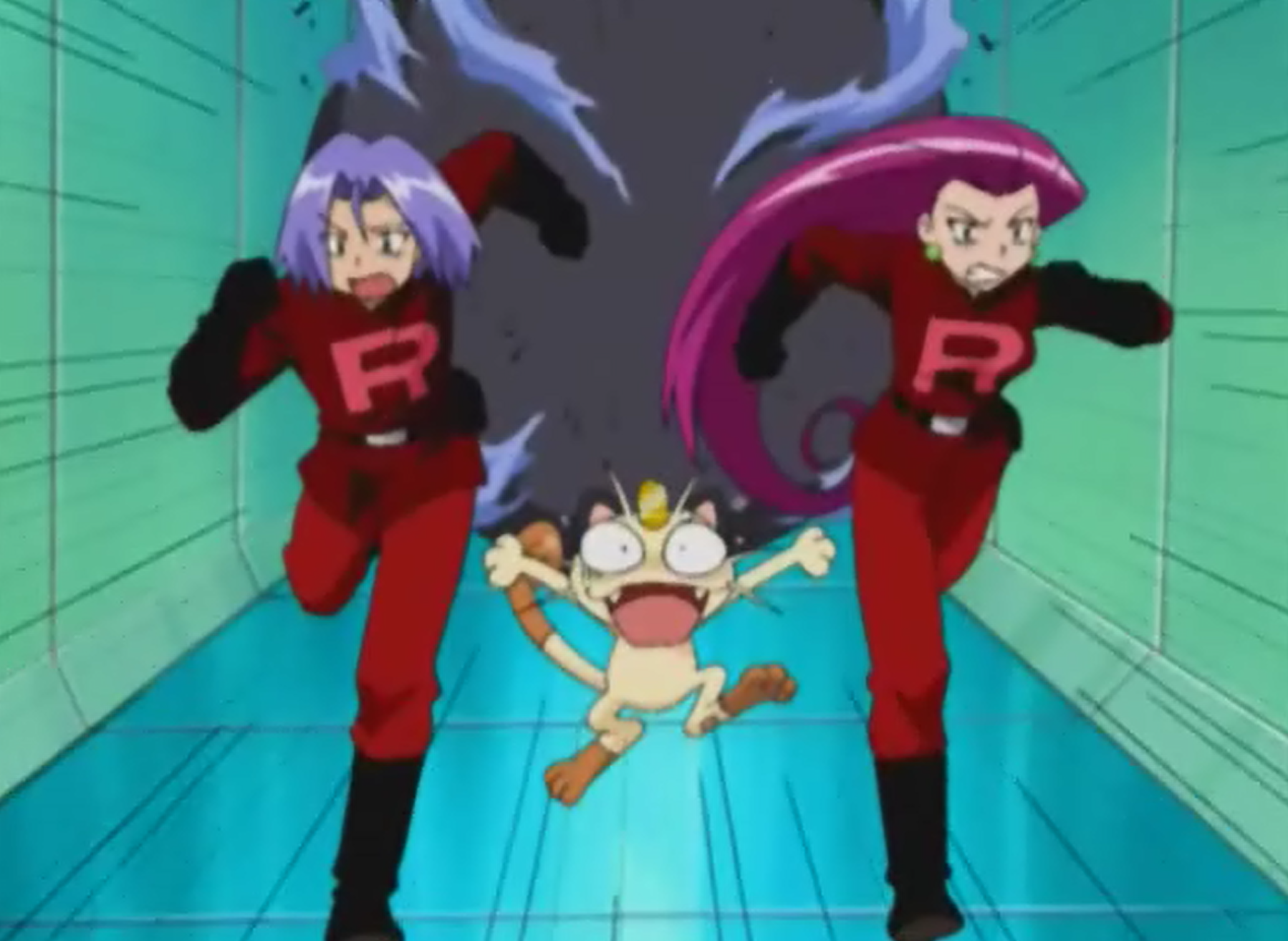 Jessie, James, and Meowth run down a hallway, fleeing a rolling boulder.