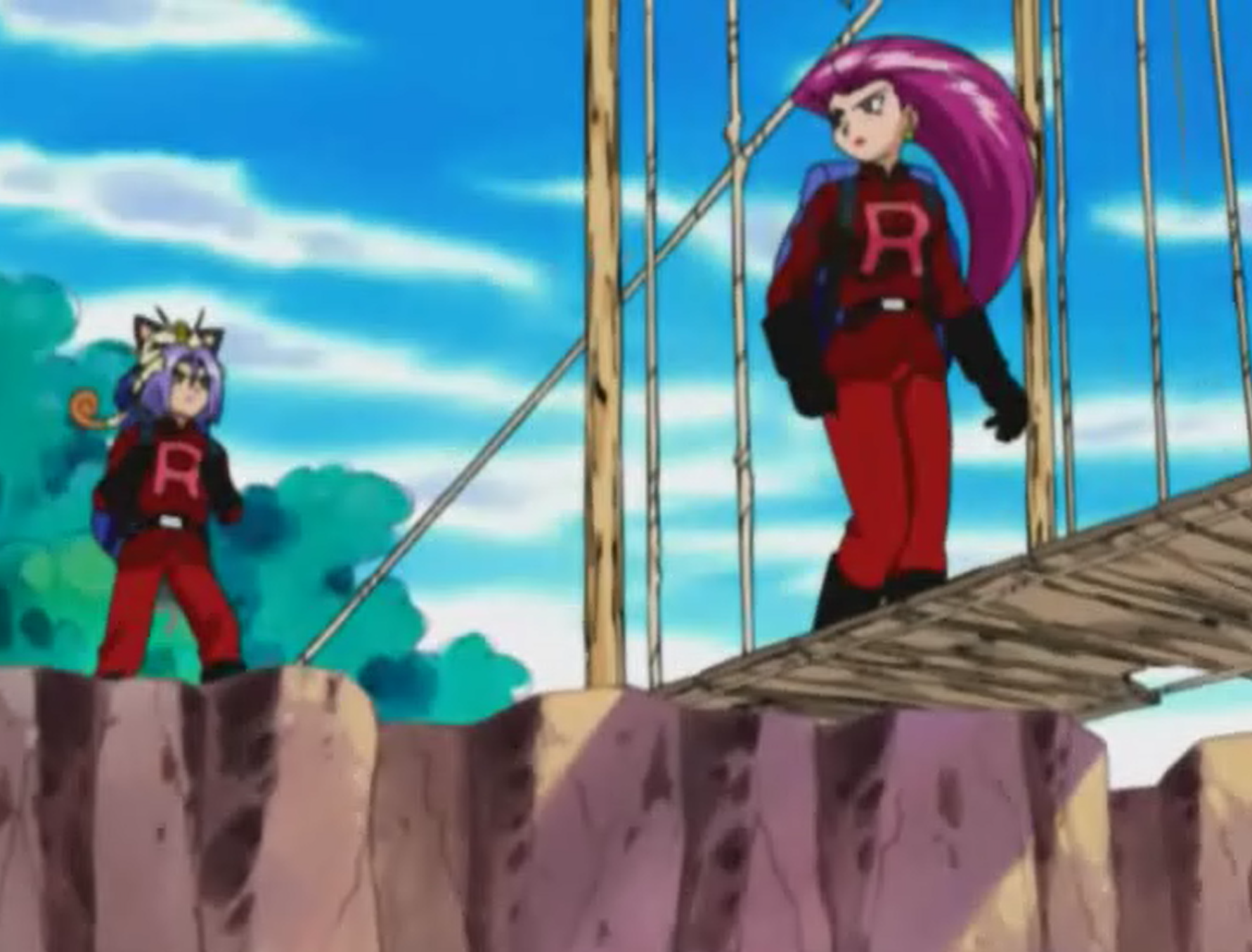 Jessie stands at the edge of a rickety bridge, glancing back at James and Meowth who are a short distance behind her. Meowth is riding on James's head.