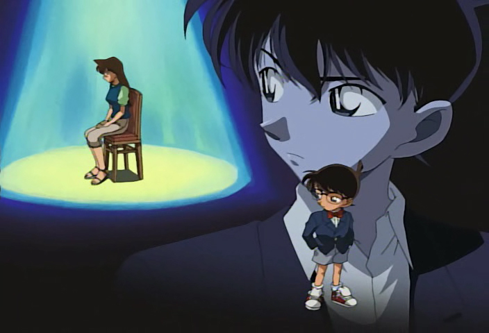 Ran sits in a chair under a spotlight looking sad. Conan with the image of Shinichi behind him, looks on.