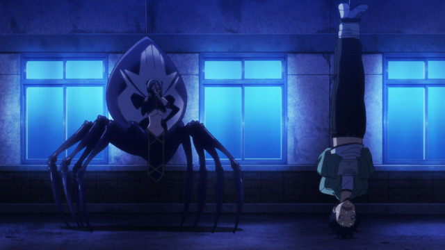 A man (Kurusu) is hung upside down in a dark room. A spider lady (Rachnera) looks at him from a short distance away.
