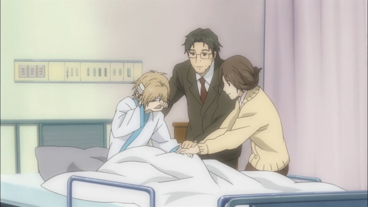 Natsume sits in a hospital bed, crying, while his two guardians lean forward to comfort him.