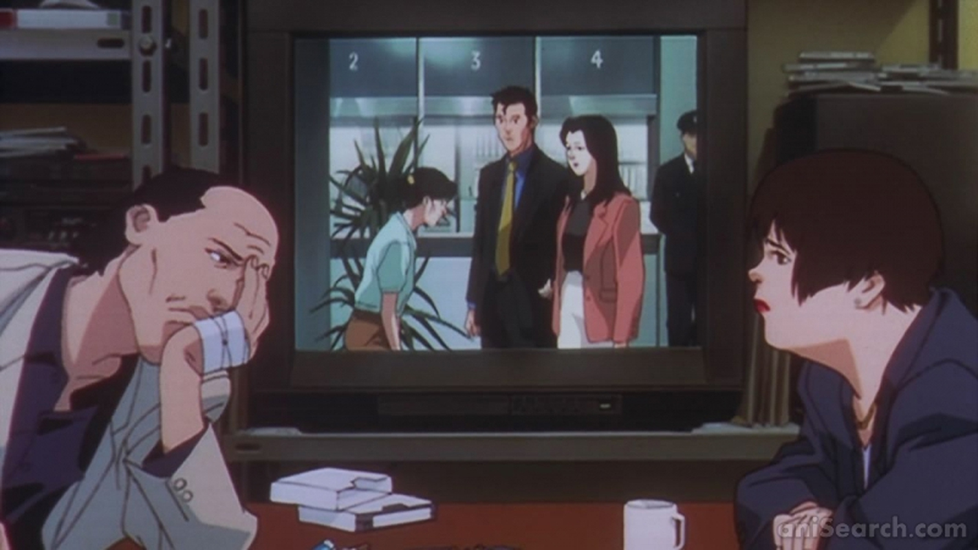 Mimas manager and the director sitting at a table while the tv show Mima is on plays in the background