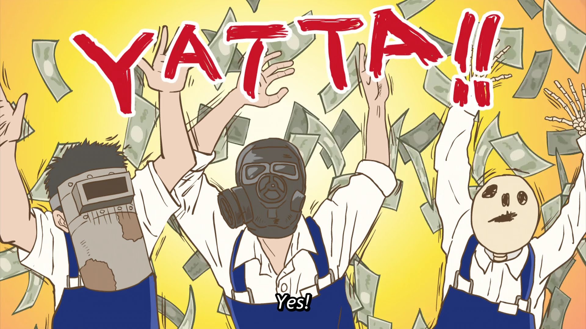 Three uniformed figures wearing a welding mask, a gas mask, and a skull face throw their arms in the arm and shout "Yatta!"