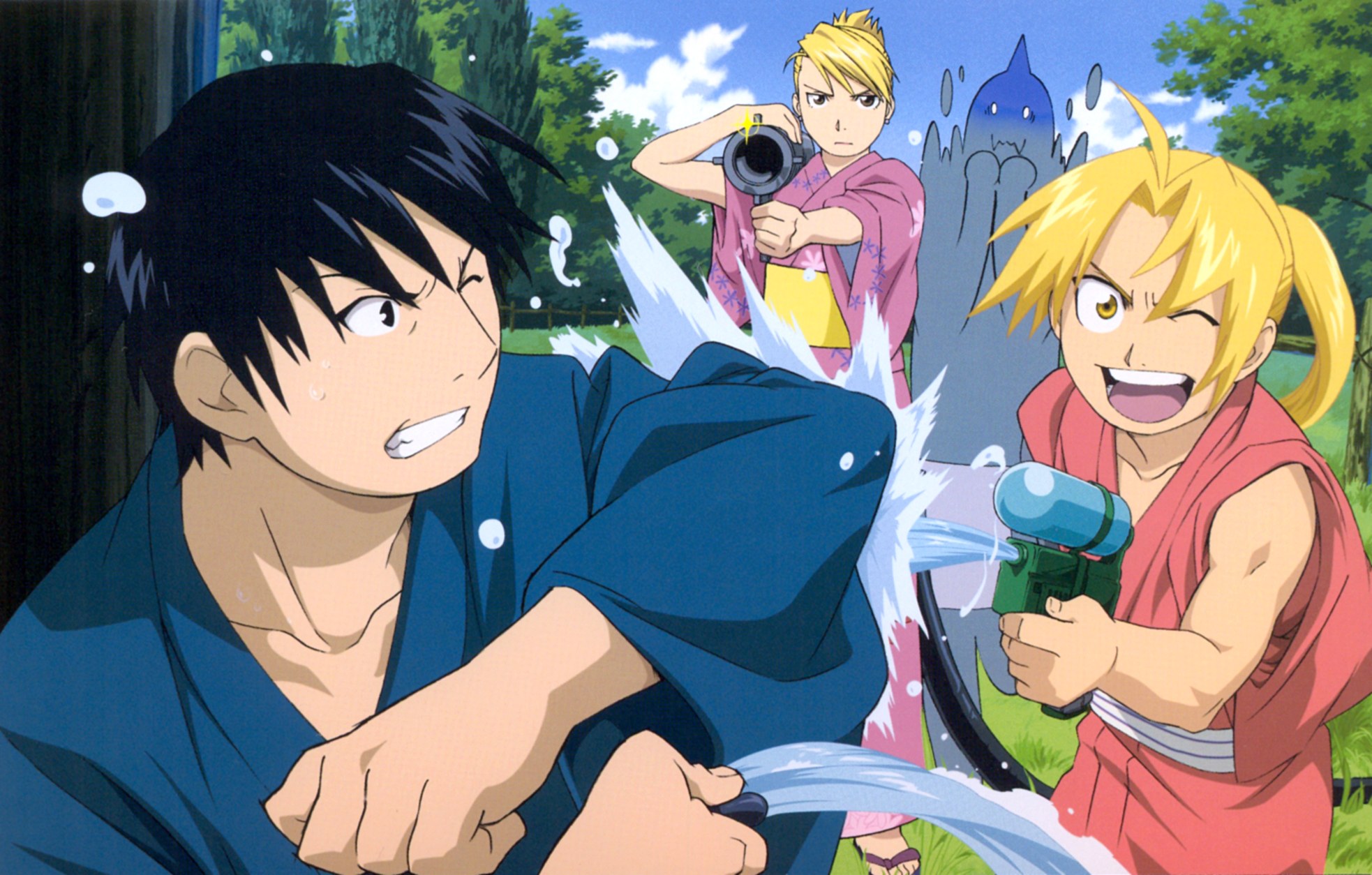 Fullmetal Alchemist promo art. Ed is laughing as he squirts Roy with a water gun. Roy looks annoyed and is trying to fend off the attack. In the background, Riza has a water-gun-bazooka on one shoulder and looks intense. Behind her, Al looks freaked out. They are all wearing yukata.