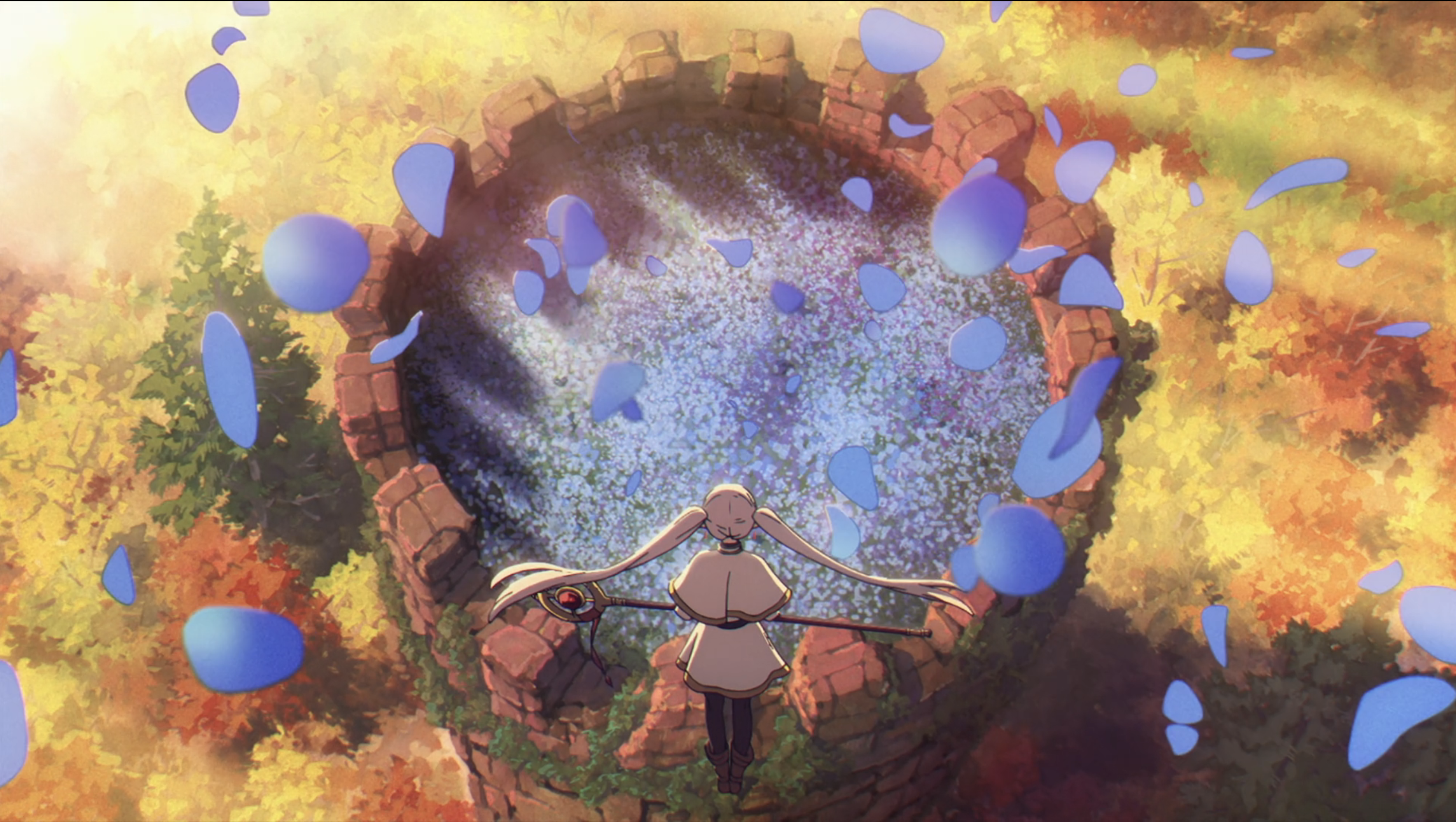 Frieren soars above a field of Blue Moon Weeds, the hero's favorite flower.