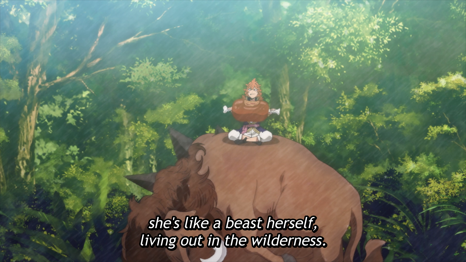Mereoleona eating a haunch of meat on top of a boar. subtitle: she's like a beast herself, living out in the wilderness