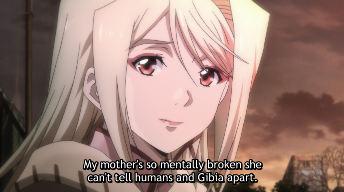 close-up of Kathleen's face. subtitle: My mother's so mentally broken she can't tell humans and Gibia apart.