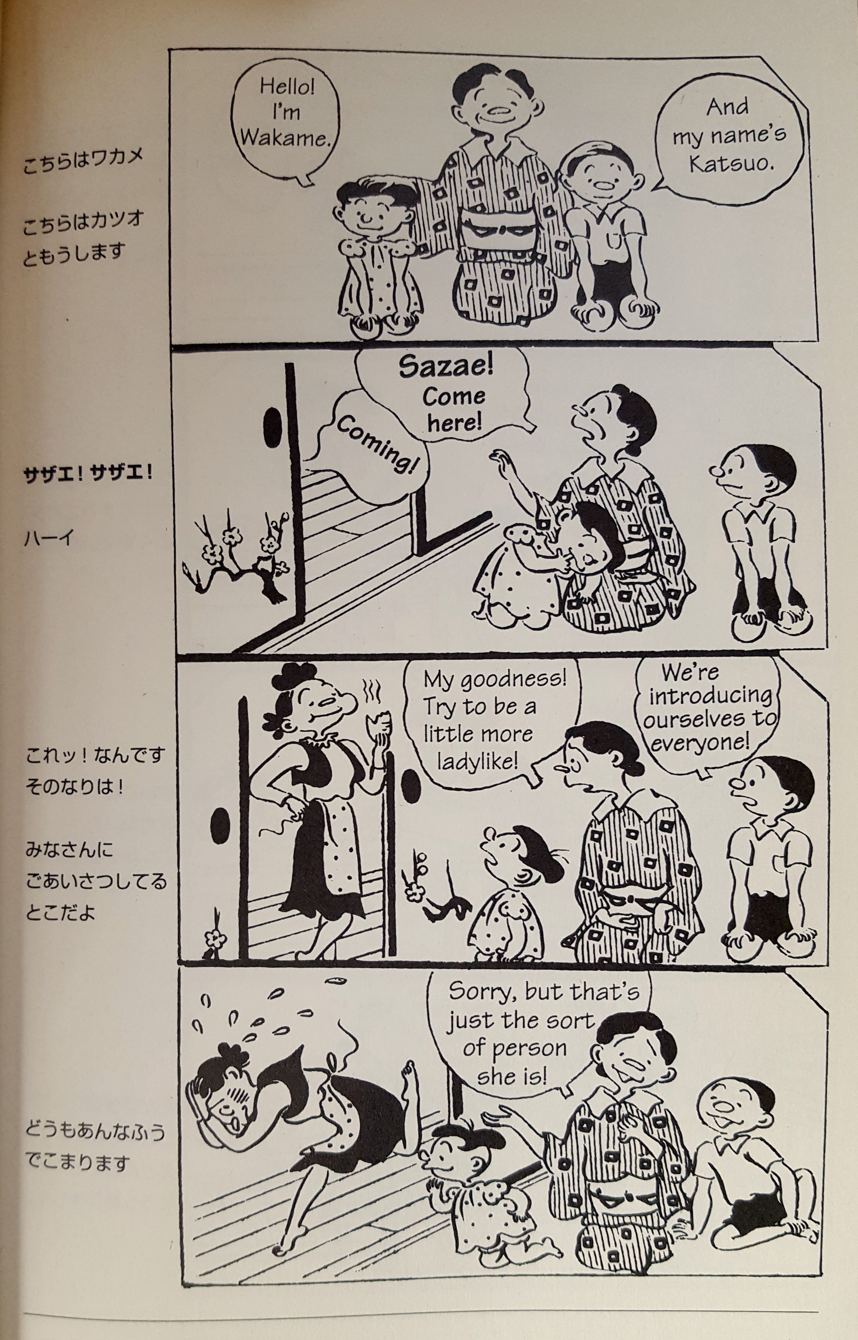 A four-panel comic. A woman in kimono kneels between two young children, one in a polo and pants and the other in a dress. The girl says "Hello! I'm Wakame." The boy says "ANd my name's Katsuo." The woman calls into another room "Sazae! Come here!" and someone off-screen says "Coming!" A young woman with messy hair enters, hand on hip and food in her mouth. The older woman says "My goodness! Try to be a little more ladylike!" The boy says "We're introducing ourselves to everyone!" The younger woman runs out, blushing with her head tucked into her hands while the older woman smiles and says "Sorry, but that's just the sort of person she is!"