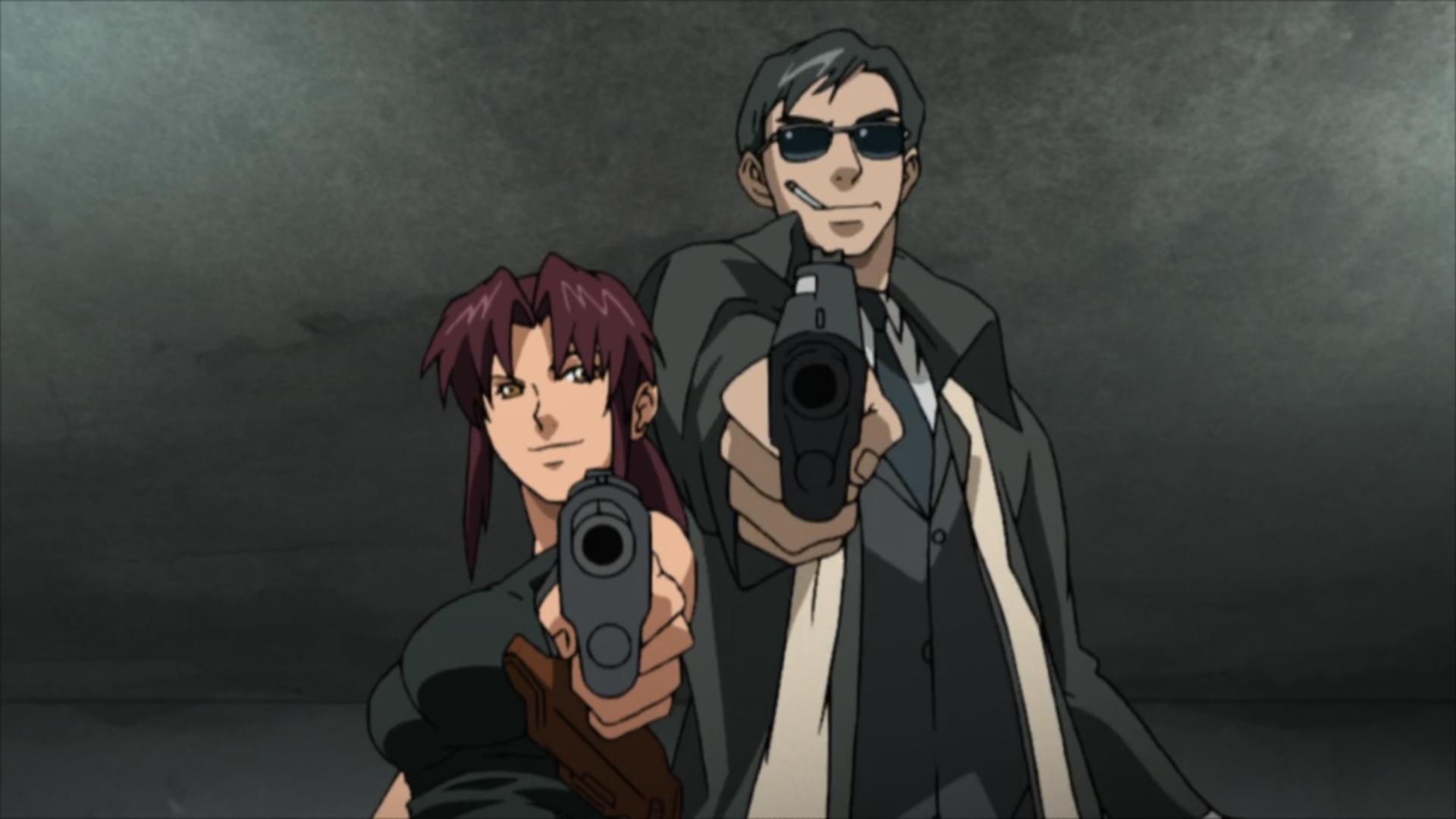A red-haired woman and a tall man in sunglasses pointing guns toward the camera