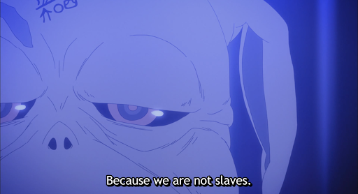close-up of an exhausted monster rat. subtitle: Because we are not slaves.