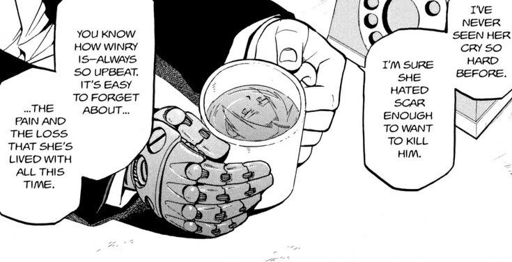 Manga panel zooming in on Ed's hands, one metal and one flesh and bone, cupped around a coffee mug, as he worries about not considering Winry